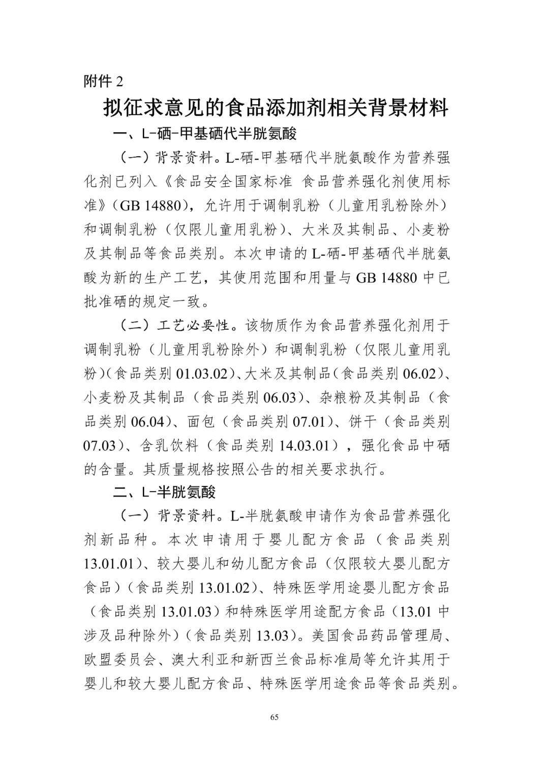 根據(jù)《食品添加劑新品種管理辦法》和《食品添加劑新品種申報(bào)與受理規(guī)定》,L-硒-甲基硒代半胱氨酸等11種食品營(yíng)養(yǎng)強(qiáng)化劑新品種、富馬酸和乙酸鈉2種擴(kuò)大使用范圍的食品添加劑的申請(qǐng),其安全性和工藝必要性已通過專家評(píng)審委員會(huì)技術(shù)審查(具體情況見附件),現(xiàn)公開征求意見。請(qǐng)于2022年9月16日前將相關(guān)意見反饋至我中心郵箱(zqyj@cfsa.net.cn),逾期將視為無(wú)意見。