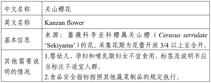公開受理14種,分別是瀘州古藺趕黃草、(3R,3’S)-二羥基-β-胡蘿卜素、馬奇果提取物、瓜蔞子、桃膠、馬尾松松針、文冠果葉、紅糖低聚果糖、酵母蛋白、杠柳葉、D-阿洛酮糖、油莎豆、櫻花提取物、乳雙歧桿菌BLa80;