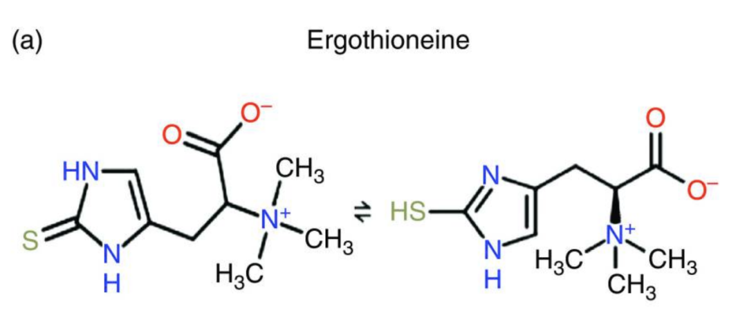 1911年,Barger 和 Ewins 確定了麥角硫因的結(jié)構(gòu)。它是同時(shí)具有硫醇和硫酮形式的互變異構(gòu)體,并且硫酮互變異構(gòu)體在生理pH下占主導(dǎo)地位,這使得麥角硫因具有異常強(qiáng)大的抗氧化性。臨床數(shù)據(jù)顯示,麥角硫因清除自由基的能力是谷胱甘肽的14倍,輔酶Q10的30倍。